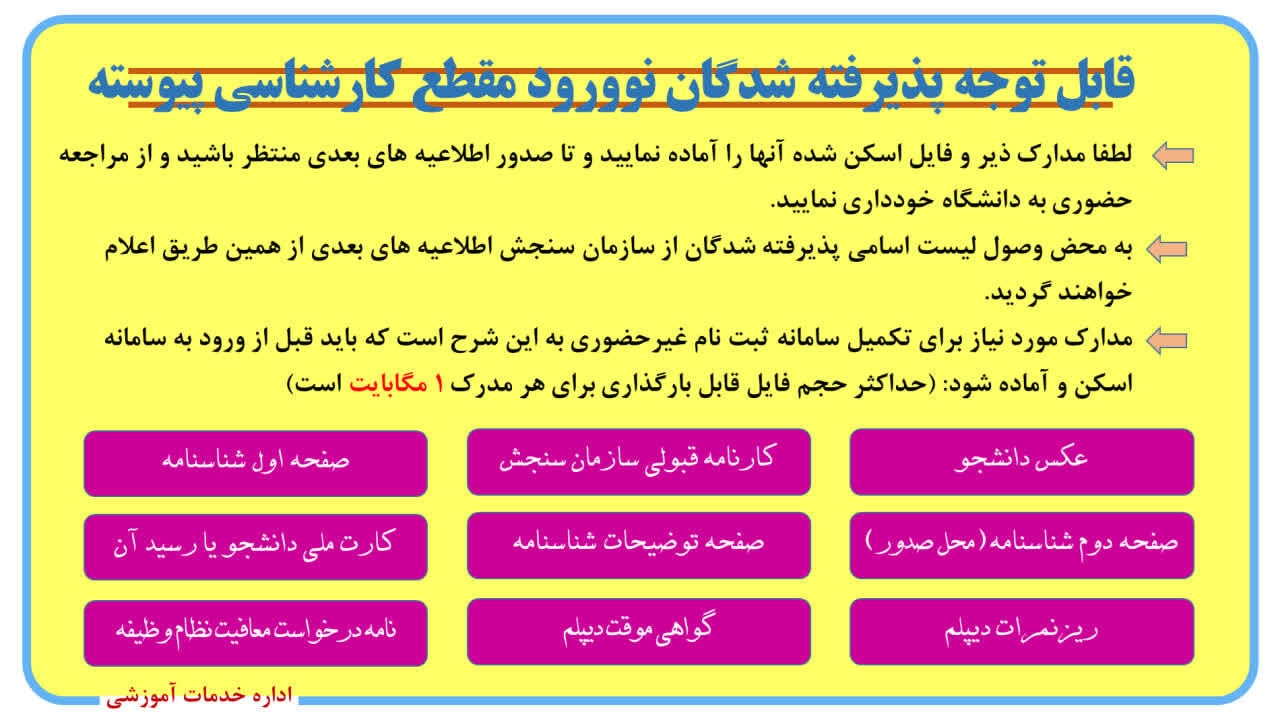 🔹ذیرفته شدگان دوره کارشناسی ناپیوسته که هنوز گواهی موقت خود را دریافت ننمودهاند به جای آن میتوانند یا تاییدیه دارای کدصحت از سامانه سجاد را بارگذاری کنند یا نامه زیر را به امضای اداره آموزش محل تحصیل خود برسانند و آن را بارگذاری نمایند.